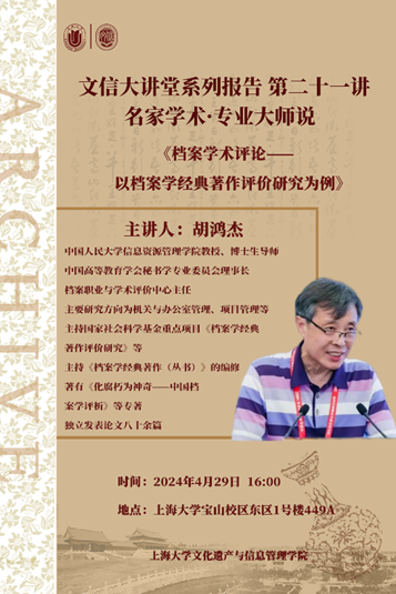 学术著作评价一直是一个难题,建立客观、公正、科学、有据的学术著作评价标准,成为学界的热切期盼。中国人民大学信息资源管理学院教授、博士生导师,中国高等教育学会秘书学专业委员会理事长,档案职业与学术评价中心主任胡鸿杰将带来“文信大讲堂”系列报告之《档案学术评论——以档案学经典著作评价研究为例》。结合国家社会科学基金重点项目优秀结题成果,通过对档案学术评价的论述及过往学术评价中的问题分析,借鉴图书馆、出版界等领域的经验,首次从内容、形式和影响力三个方面提出了学术著作的评价标准,并以此评价标准为依据,对《档案学经典著作》进行了具体指标分析,有利于推动学术生态良性发展,促进学科的原创性高水平成果。