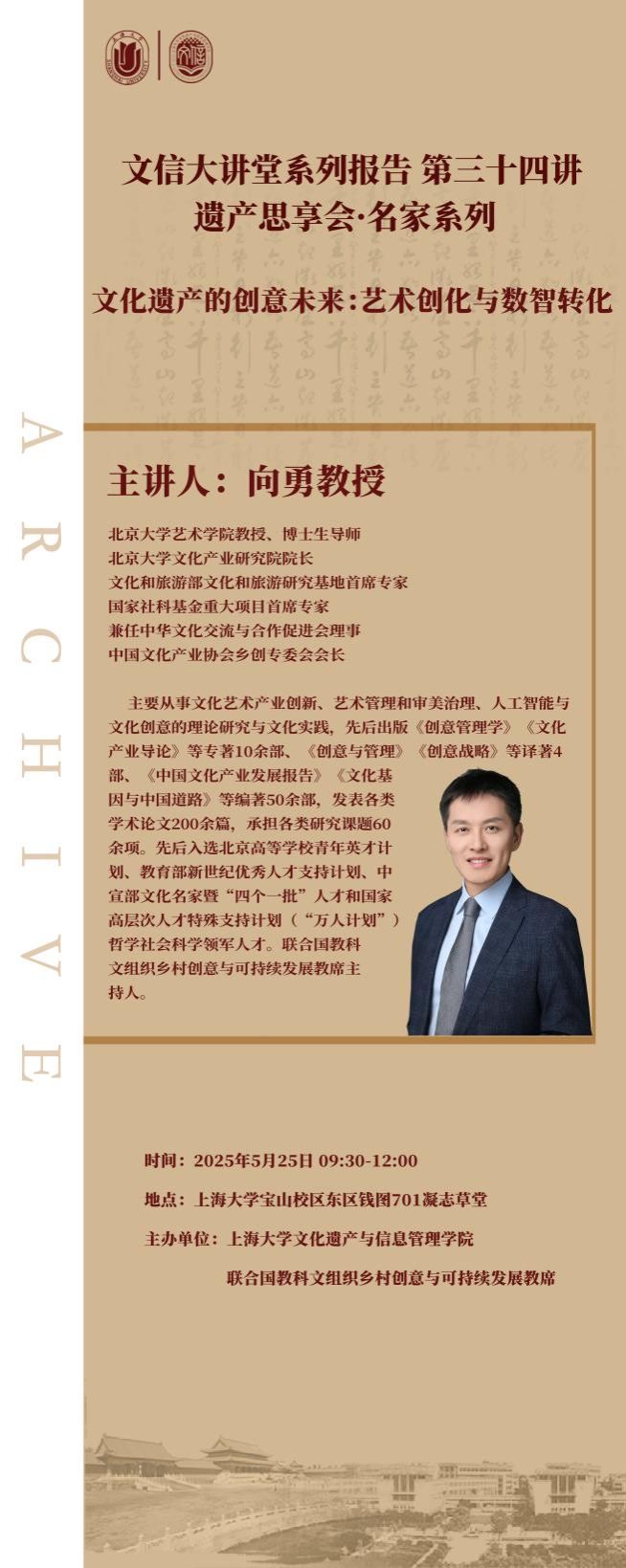 首期活动特别邀请到北京大学艺术学院教授、北京大学文化产业研究院院长向勇,与我们共同探讨“文化遗产的创意未来”。在理论与实践的交汇处,探索文化遗产如何焕发当代表达的生命力,助力社会可持续发展。在这里,专业对话不设边界,思想交锋催生灵感,文化遗产的未来将在知识共创与智慧共鸣中不断拓展。
