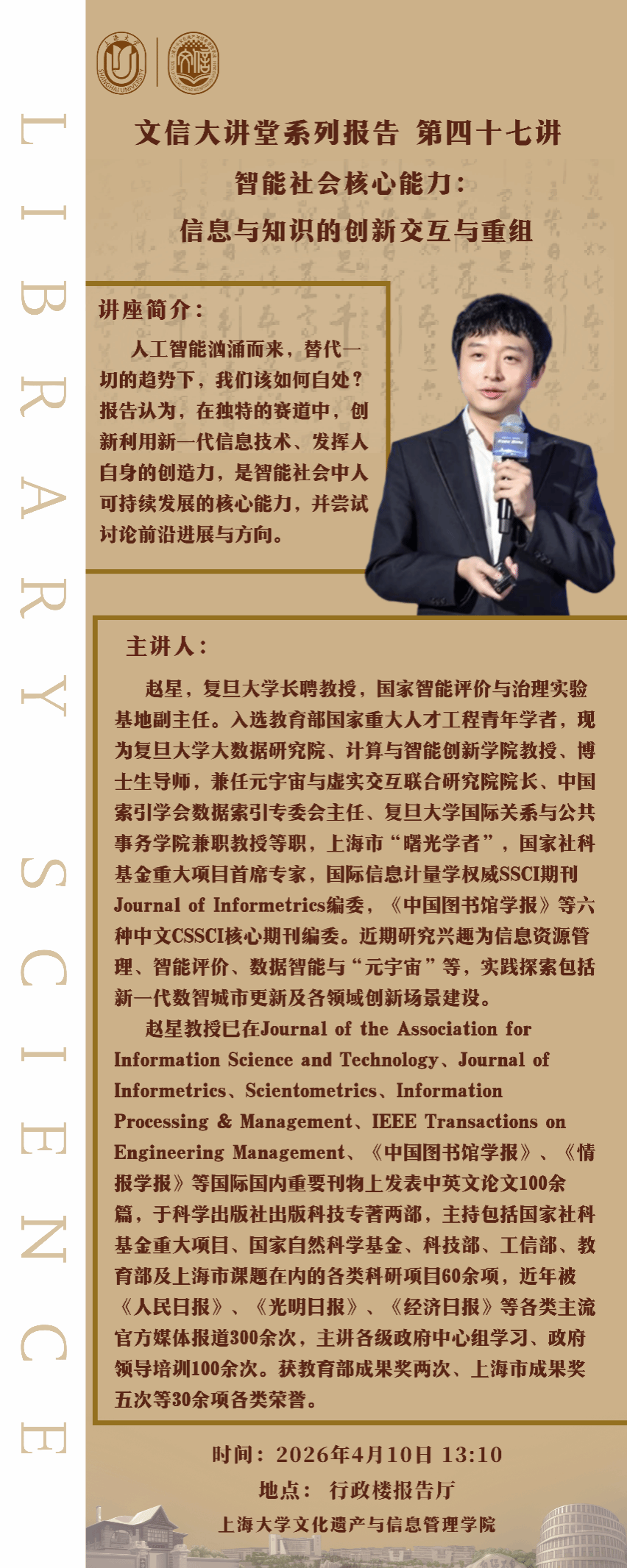 赵星,复旦大学长聘教授,国家智能评价与治理实验基地副主任。入选教育部国家重大人才工程青年学者,现为复旦大学大数据研究院、计算与智能创新学院教授、博士生导师,兼任元宇宙与虚实交互联合研究院院长、中国索引学会数据索引专委会主任、复旦大学国际关系与公共事务学院兼职教授等职,上海市“曙光学者”,国家社科基金重大项目首席专家,国际信息计量学权威SSCI期刊Journal of Informetrics编委,《中国图书馆学报》等六种中文CSSCI核心期刊编委。近期研究兴趣为信息资源管理、智能评价、数据智能与“元宇宙”等,实践探索包括新一代数智城市更新及各领域创新场景建设。