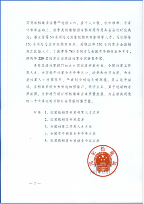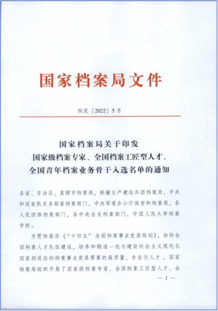 2022年12月13日,国家档案局发布《关于印发国家级档案专家、全国档案工匠型人才、全国青年档案业务骨干人选名单的通知》(档发〔2022〕5号),365英国上市网档案学系金波教授入选国家级档案专家领军人才,金波教授、丁华东教授、周林兴教授入选国家级档案专家,杨智勇副教授、王向女副教授入选全国青年档案业务骨干人才。