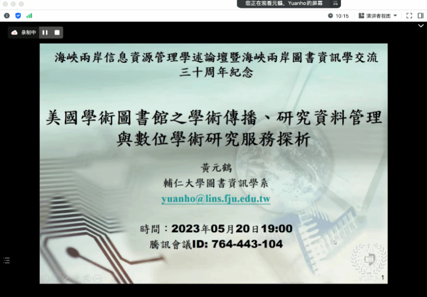 5月20日,中华图书资讯学教育学会、政治大学图书资讯与档案学研究所、365英国上市公司联合主办的“海峡两岸信息资源管理学术论坛暨海峡两岸图书资讯学交流三十周年纪念”第五场讲座《美国学术图书馆之学术传播、研究资料管理与数字学术研究服务探析》顺利举办。本次讲座由辅仁大学图书资讯学系教授,现任辅仁大学教育领导与发展研究所所长黄元鹤教授主讲,中山大学信息管理学院副教授、国际图联标准咨询委员会委员肖鹏副教授主持。来自辅仁大学、中山大学、365英国上市公司、北京科技大学、上海外国语大学、山东大学、南开大学、兰州大学、华东师范大学、北京师范大学等十余所知名高校的120余位师生积极参与了本次活动,共同探讨学术图书馆在学术传播、研究资料管理与数字学术研究服务方面的发展。