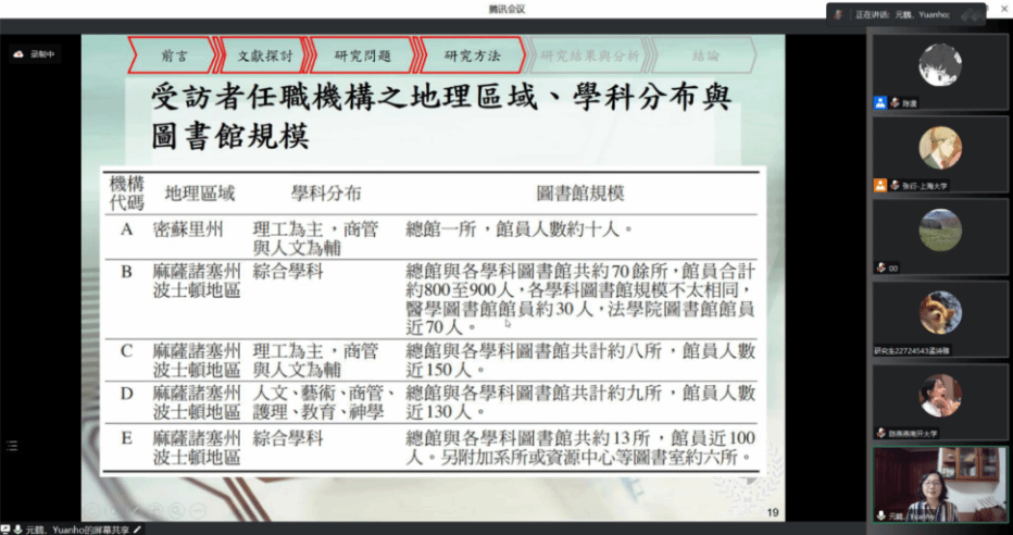 首先,黄元鹤教授详细阐述了学术传播馆员、研究资料管理馆员和数字学术研究馆员的职称、角色任务和所需的知识技能。她指出自己的研究是通过对美国学术图书馆的9位馆员进行访谈展开的。在讲述中,她还简要介绍了受访者的工作内容、所在机构的地理分布、学科领域的分布以及图书馆的规模。