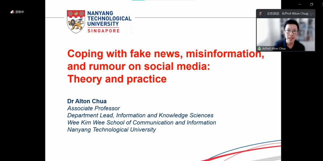 新加披南洋理工大学黄金辉传播与信息学院院长聘副教授兼任信息与知识学科系主任Alton Chua分享题为《应对社交媒体平台上的假新闻、虚假信息和谣言:理论与实践》(Coping with fake news,miinformation and rumor on social media:theory and practice)的主题报告。Alton Chua教授从如何判断网络信息的真假,普通用户是否会传输网络信息以及网络信息的分享范围三个方面做了精彩的报告。