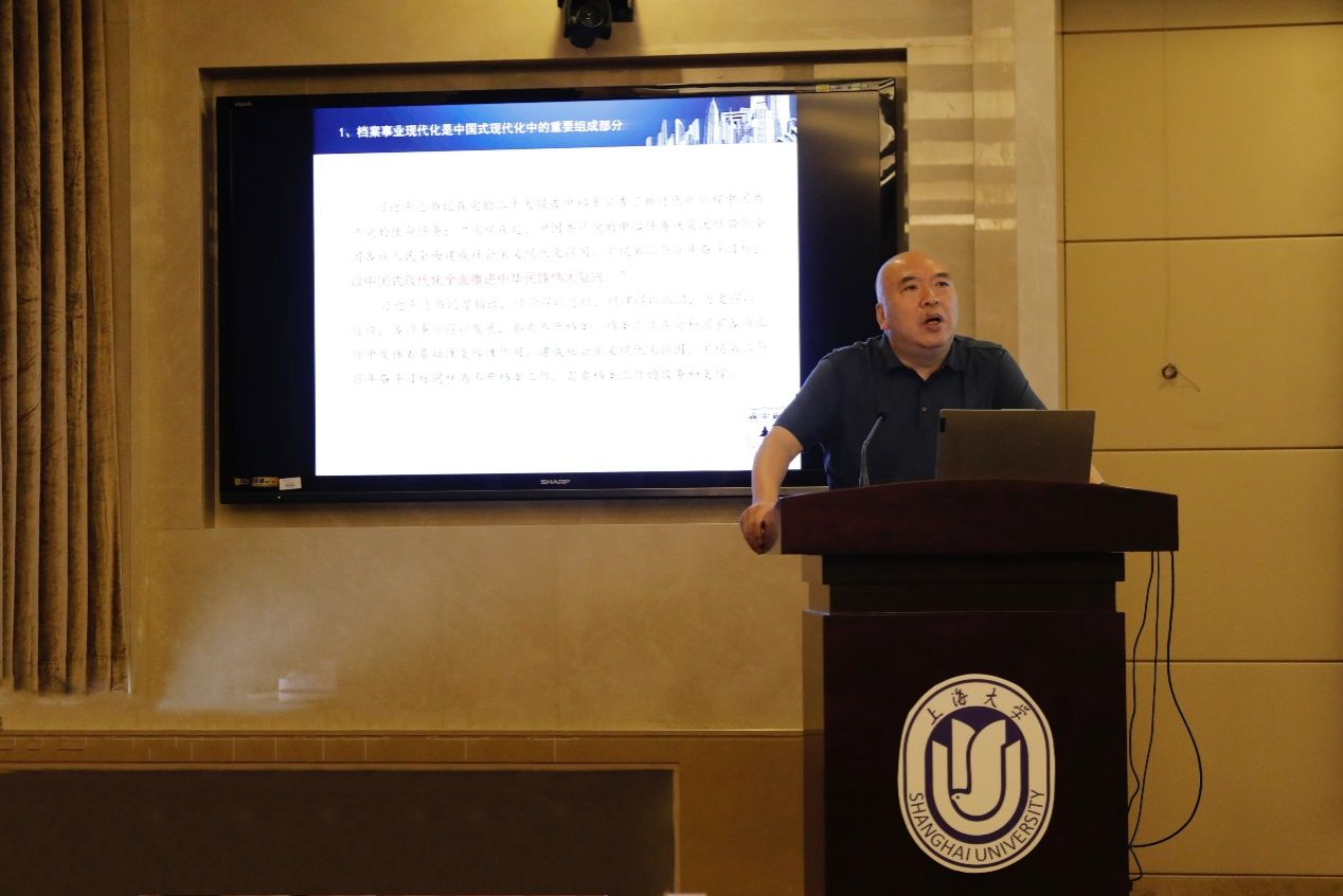 由国防大学政治学院薛匡勇教授主持,南京大学信息管理学院吴建华教授作题为“中国式现代化背景下档案工作的方法论思考”的主旨报告。吴建华教授首先从二十大的背景切入主题,论述档案事业现代化是中国式现代化中的重要组成部分,接着分享了关于方法论的基本认识,并构建了档案现代管理模式,认为档案工作是一项基础性、支撑性的工作,最后提出了全维度、全过程的管理模式,构建档案工作的时序体系。