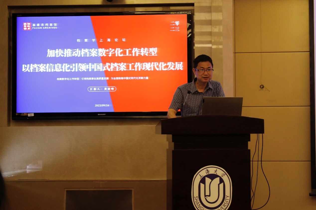 由山东大学历史文化学院曲春梅教授主持,福建省档案馆黄建峰副馆长作“加快推动档案工作数字化转型,以档案信息化引领中国式档案工作现代化发展”的主旨报告。黄馆长从理论思考、实践经验和发展建议三个方面分享了关于档案数字化工作转型的真知灼见。提出了以档案数字资源为基础,以先进信息技术为手段,以档案工作业务转型为核心的系统设计,并从统一档案数字化工作转型重要性和意义的认识、推进档案数字化工作转型的顶层设计和规划、提高新时代数字档案馆(室)的建设水平和提升档案数字资源的共享水平四个方面实现档案数字化工作转型,真正发挥档案工作服务社会各项事业发展的重要作用。