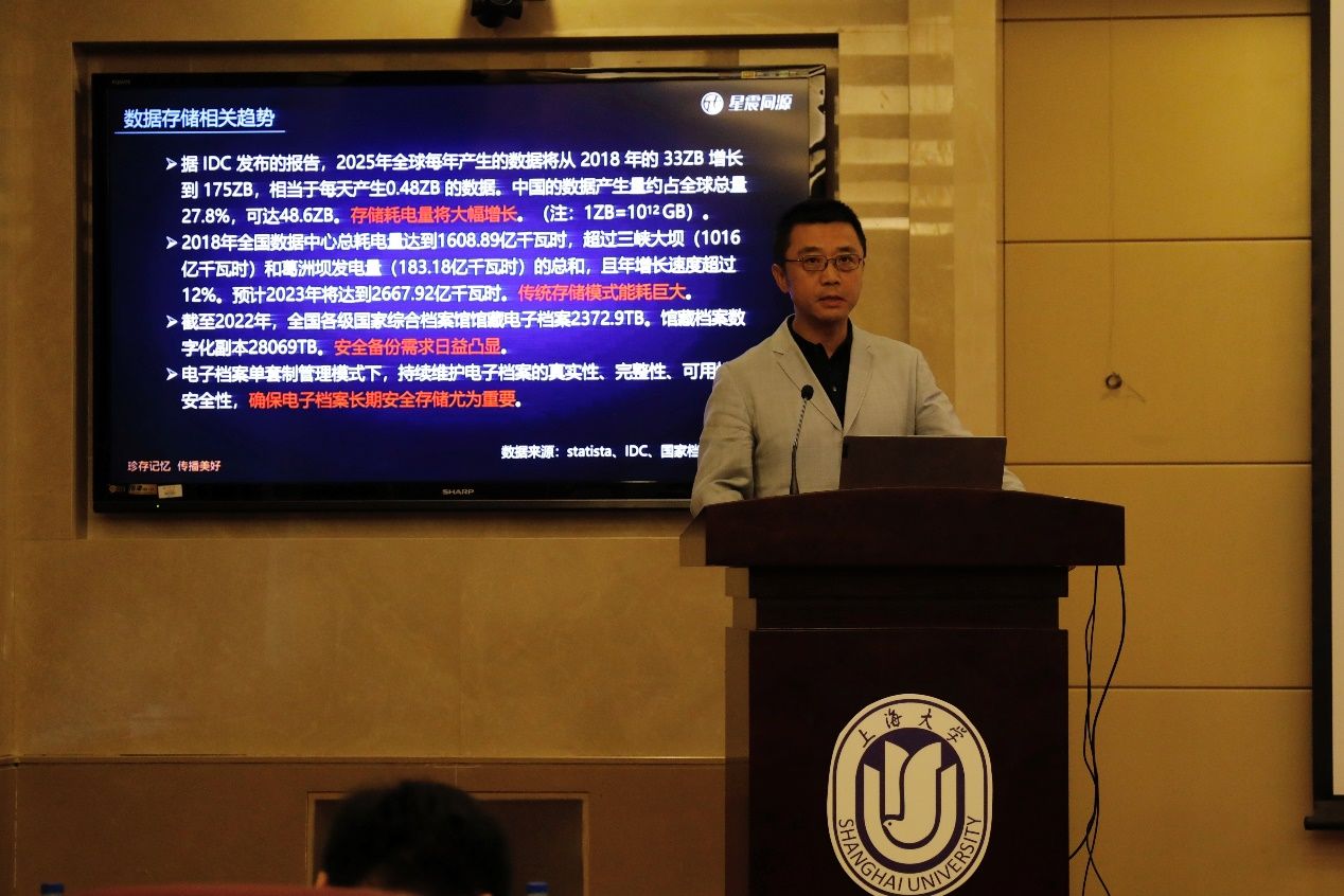 由河北大学管理学院李颖教授主持,北京星震同源数字系统股份有限公司董事长赵伟东作“新技术赋能重要数据长期安全存储”主题的报告。赵伟东董事长分析了目前数据备份存在的诸多问题,如属性单一、可靠性低、代价高昂、封闭技术等,为我们介绍了磁光电网络存储技术的数据存储系统,以及利用该系统长期存储电子档案等重要数据的优势所在。报告指出,“十四五”全国档案事业发展规划中已经明确把国家电子档案战略备份中心建设项目列为“十四五”档案信息化的强基工程,利用磁光电网络存储技术,可以有效维护电子档案的磁性,保障电子档案长期安全存储,此外,还可以实现磁光存储、数据服务和智慧档案等多样化功能。