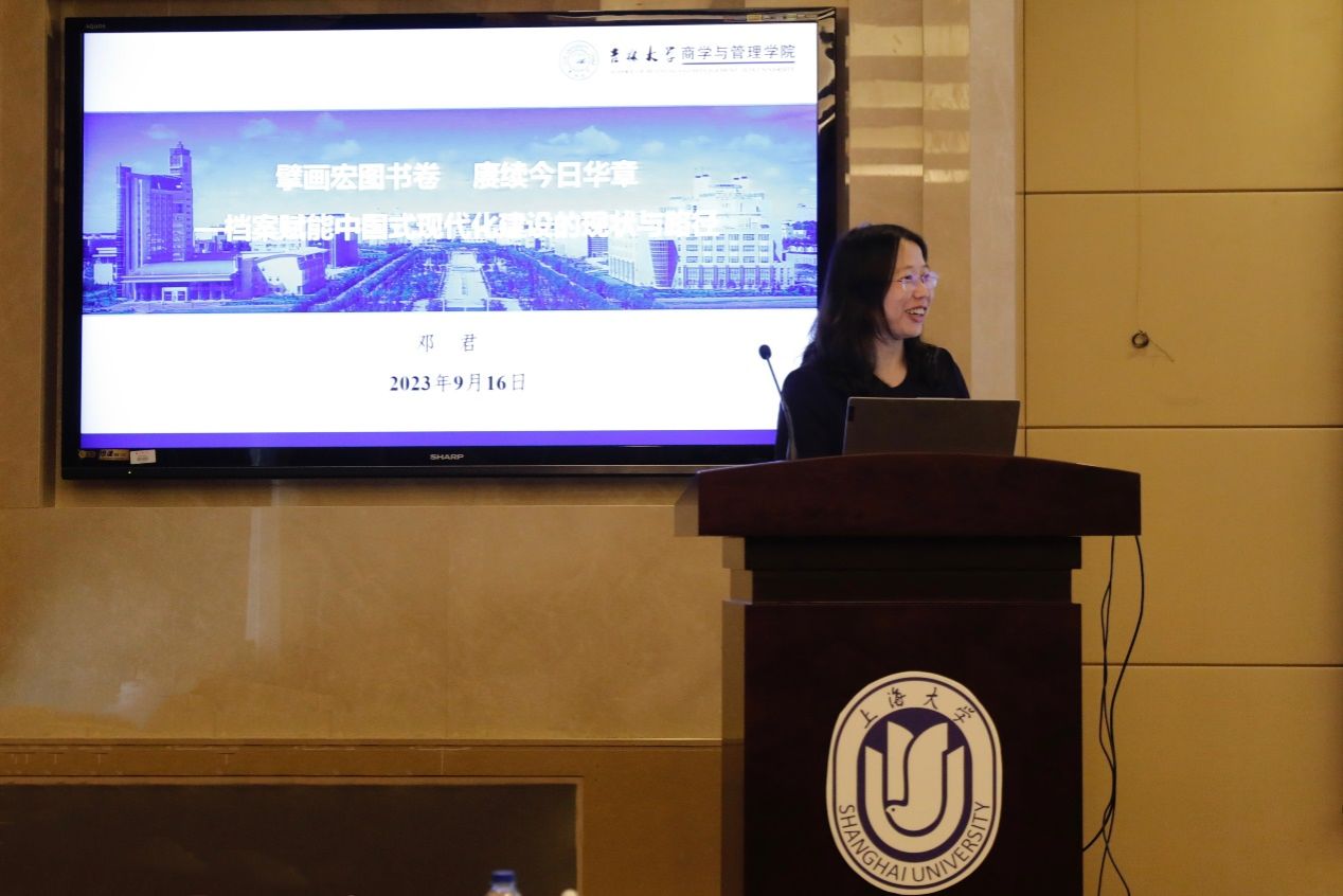 由北京联合大学应用文理学院沈蕾教授主持,吉林大学商学与管理学院邓君教授作题为“擘画宏图画卷,赓续今日华章——档案赋能中国式现代化建设的现状与路径”的主旨报告。邓君教授紧密围绕党的二十大提出的“建设中国式现代化”任务进行思考,不仅解释了什么是中国式现代化,还用很多实例归纳档案人在档案赋能中国式现代化建设所做的努力,强调要牢记使命,将中国式现代化的思想、理念、要求落实到本职工作中,以档案之所能,赋中国式现代化之所需,讲好中国故事、记录好中华伟业、满足好中国人民日益增长的精神文化需求,为中国式现代化建设与中华民族的伟大复兴贡献出档案的卓越力量!
