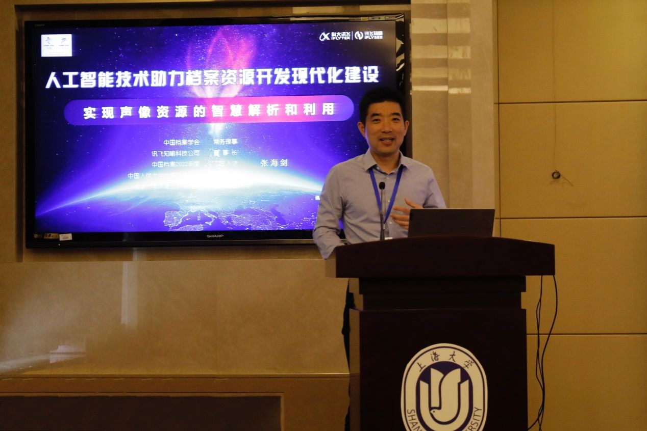 由天津师范大学管理学院蒋冠教授主持,讯飞知喻科技公司张海剑董事长作题为“人工智能技术助力档案资源开发现代化建设”的主旨报告。张海剑董事长从应用开发的实践成果出发,直击档案工作的痛点问题——档案资源的开发利用,展示了讯飞知喻在国家科技自主创新战略背景下的作为,演示了AI赋能档案工作的具体应用场景,以声像资源为例,展现其全过程数字化采集、数字化开发和利用的有效实践,描画了档案工作美好的未来图景。