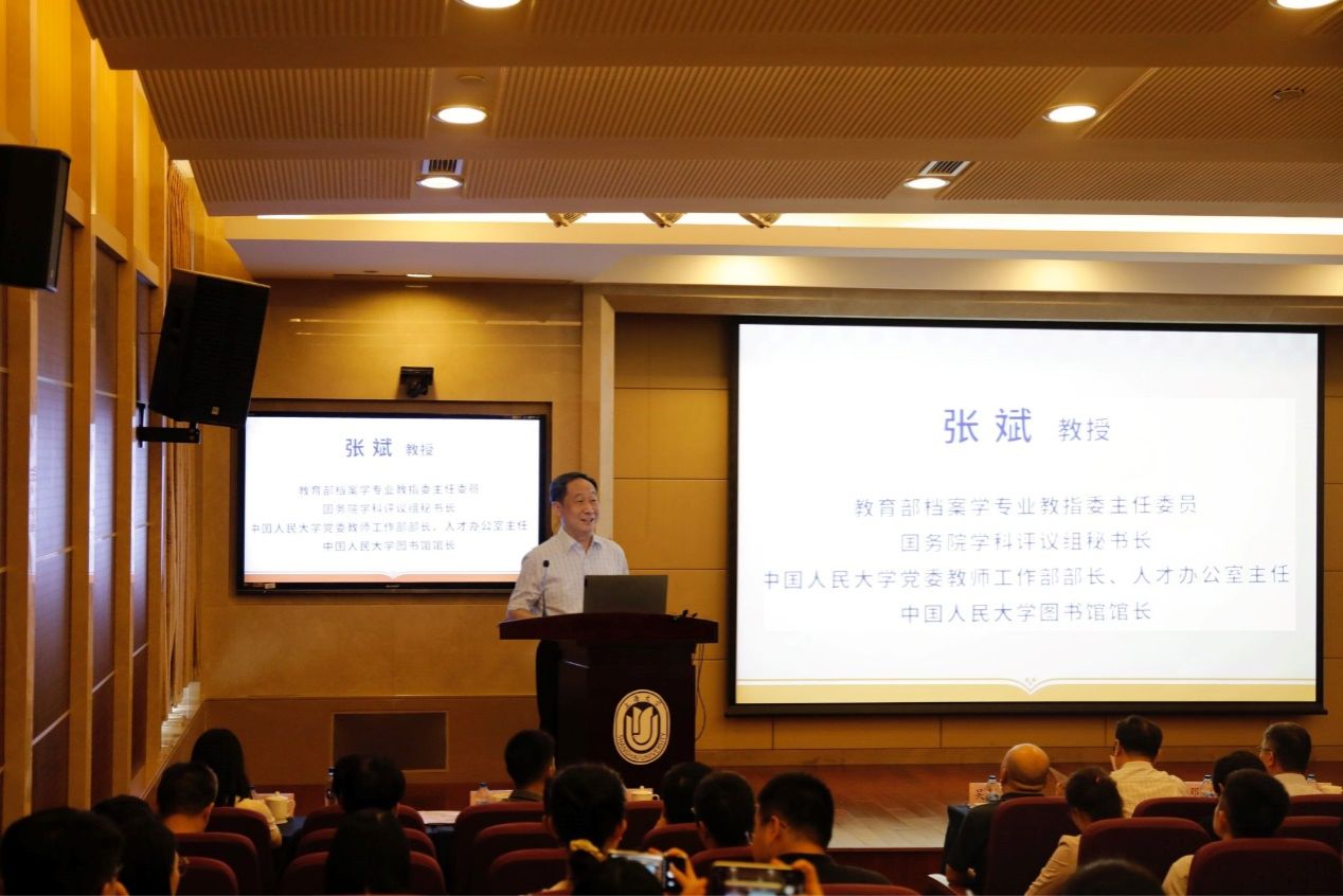 教育部档案学专业教指委主任委员、中国档案学会副理事长、国务院信息资源管理学科评议组秘书长、中国人民大学党委教师工作部部长、人才工作领导小组办公室主任、图书馆馆长张斌致辞。首先对本次学术论坛的召开表示热烈祝贺,并提出在档案赋能中国式现代化建设过程中,高校应该从三个方面进行努力:第一,提供理论支撑。在数字环境下,高校应从理论变革切入为事业发展提供支持;第二,提供科技支撑。高校的重要性就体现在科技创新,应该和实践部门齐头并进;第三,提供人才支撑。人才培养是高校立足的根本,高校应当通过自我革命适应档案事业发展的人才需求。
