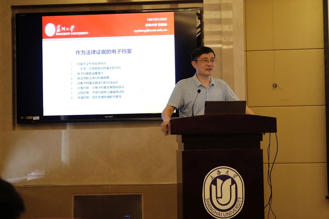 由武汉大学信息管理学院王平教授主持,苏州大学社会学院教授张照余作“作为证据的电子档案”主题的报告。张教授从档案凭证作用及其特点、单套制归档“失效”的风险、电子档案的证据效力、真实性的法律与档案视角、对电子档案证据效力的司法认定、档案的规范性性管理等六个方面展开论述,认为我们对所有的档案都要从法律证据的角度来审视它的保管,一是它能不能作证,二是它作证的力度怎么样。如果档案拿到法庭上去作为法庭证据时没有作用,或者作用力很低,那么档案的保管就是失效的。同时强调,证据力度的大小取决于三个因素,分别是合法性、关联性和真实性,而档案更需要考量的就是它的真实性。我们需要对电子档案进行对象控制、过程控制和环境控制等规范性管理,以保障电子档案作为证据时的可信度。