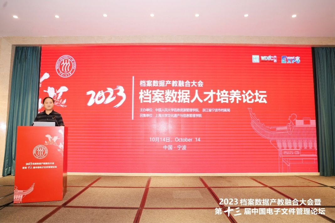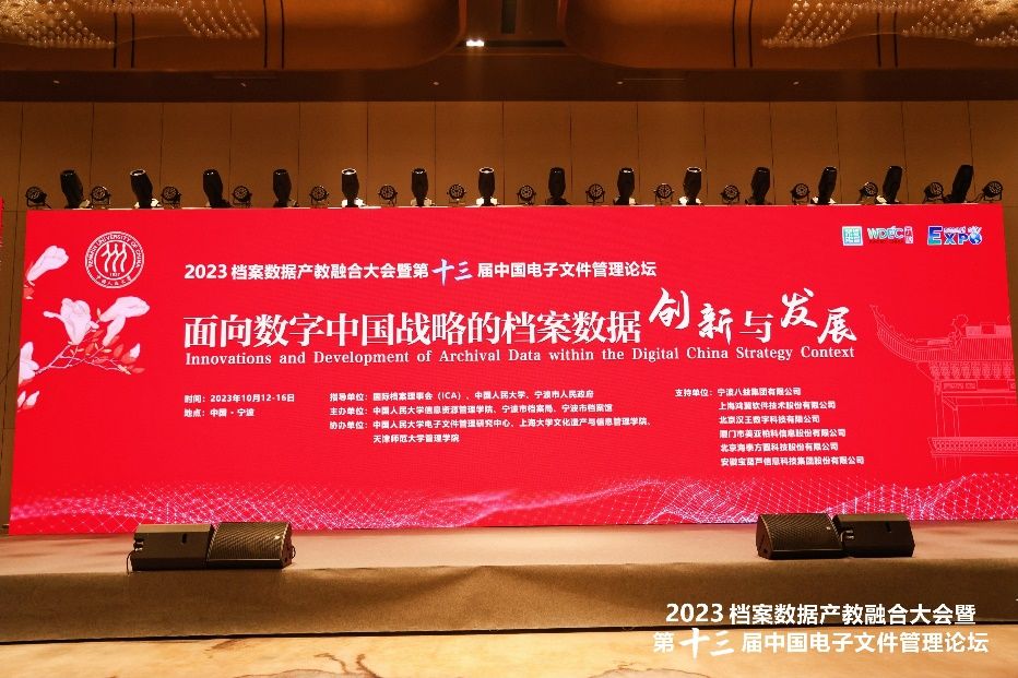 2023年10月14日,档案数据产教融合大会暨第十三届中国电子文件管理论坛开幕式在浙江宁波举办。本次会议以“面向数字中国战略的档案数据创新与发展”为主题。来自党政机关、企事业单位、高等院校、科研院所、档案信息技术公司的约500位专家学者、嘉宾代表相聚甬城,分享档案数据治理理论前沿和实践经验,共商档案数据产教融合方法与人才培养路径。365英国上市网学术带头人金波教授、学院党委书记丁华东教授、档案学系主任周林兴教授及部分师生参加了本次论坛。