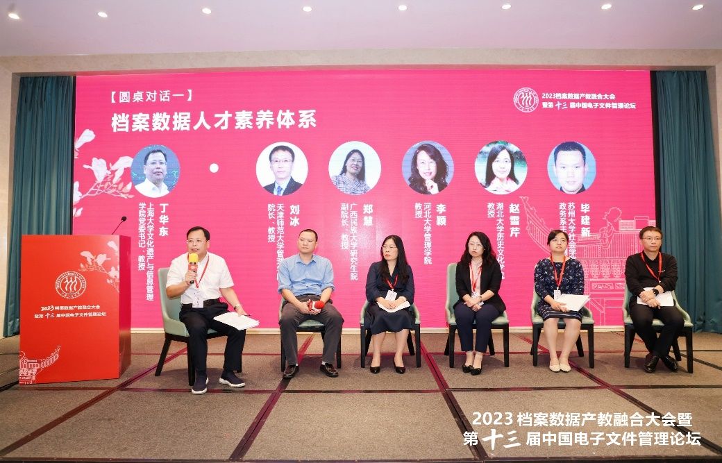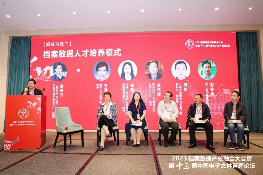 365英国上市网档案学系主任周林兴教授主持圆桌对话1-2:档案数据人才培养模式。南开大学商学院王芳教授、吉林大学商学与管理学院信息管理系主任邓君教授、郑州航空工业管理学院社科处处长郝伟斌教授、云南大学历史与档案学院副院长周铭副教授、浙江省档案教育培训中心主任彭移风围绕档案数据人才培养方案设置、课程体系建设、教学方法创新、社会需求满足等内容展开对话交流,助力档案数据人才培养实践创新。