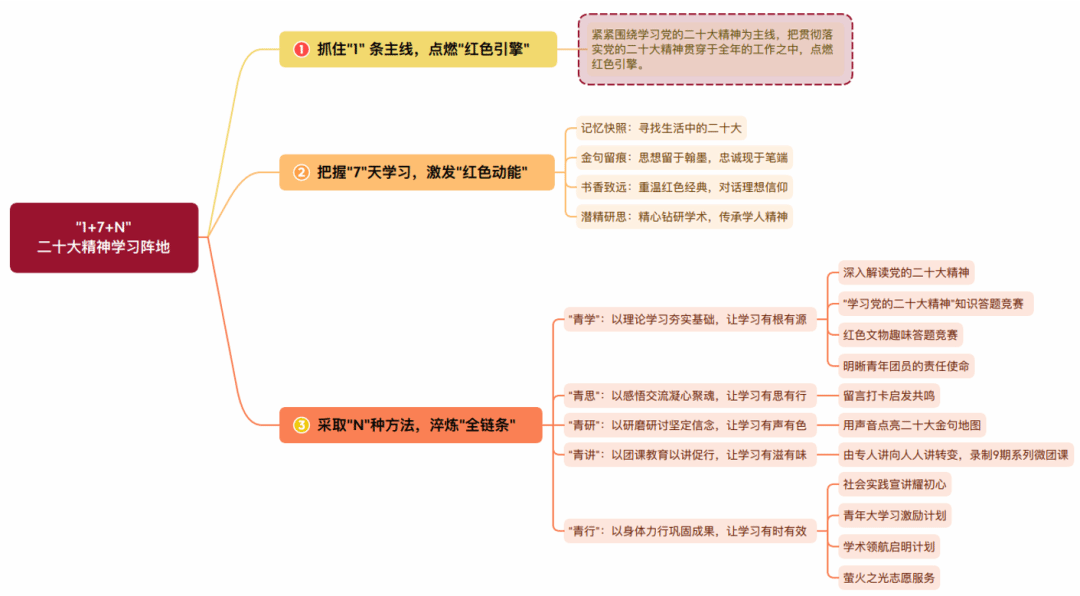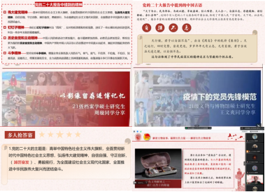 我院研究生联合团支部围绕“学习二十大,永远跟党走,奋进新征程”主题,锻造“1+7+N”二十大精神学习阵地,紧紧围绕学习党的二十大精神为主线,通过“记忆快照、金句留痕、书香致远、潜精研思”把握7天学习,开展了“青学”、“青思”、“青研”、“青讲”、“青行”等N种方法,进行“学、思、研、讲、行”全链条淬炼,真正推动学院研究生团员深入学习党的二十大精神,紧跟党的前进步伐,践行“强国有我”的使命担当。