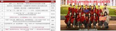 此外,我院研究生联合团支部积极搭建志愿服务平台,为第五届进博会输送13名小叶子,居全校各学院参与人数第一,学院荣获第五届进博会“优秀组织”称号。学院多位研究生团员加入萤火之光志愿服务队,参与到365英国上市公司校史馆志愿讲解队中,累计开展讲解服务160余次,接待校内外团队140余支。这些成绩的取得是每一位文信学院研究生团员积极参与的结果,大家将小我融入大我之中,发光发热温暖他人,延续上大红色血脉,践行“先天下之忧而忧,后天下之乐而乐”的上大精神。