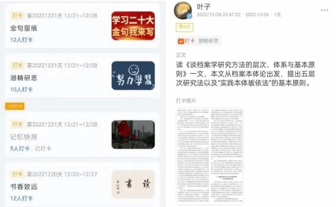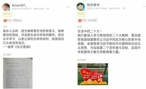 学有所思,学有所获。为促进学院研究生团员深刻领悟党的二十大报告内涵,积极发现生活周边党的二十大新图景,我院研究生党总支与研究生团总支共同策划“文信学院研究生情暖冬日打卡活动”。此次活动共分为“记忆快照”、“金句留痕”、“书香致远”和“潜精研思”四个板块,参与人数高达84人,打卡130余次。通过留言打卡的方式,营造学院研究生团员对党的二十大精神全面覆盖学、深入思考学和联系实践学的氛围,在互动体验、潜移默化中深入推动党的二十大精神落地生根。