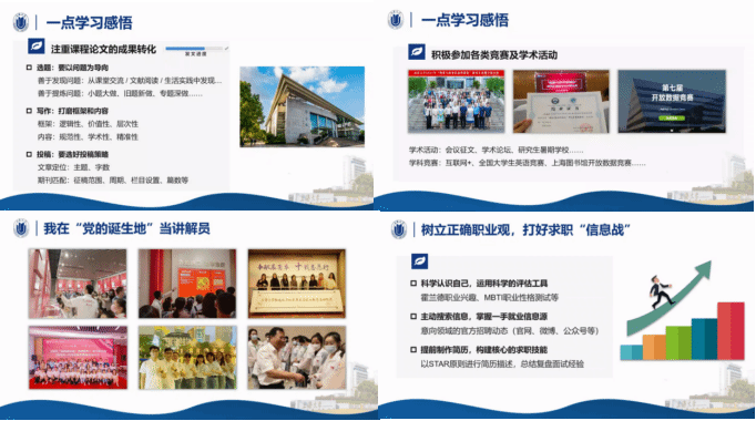 2020级档案学硕士研究生刘志森,现就职于中国船舶及海洋工程设计研究院,围绕科研学习、志愿服务和求职就业作题为“乘风破浪 逐梦前行”的生涯规划分享。在科研学习方面,刘志森以自己所在班级学生发文数据统计结果为例,指出同学们要注重课程论文的成果转化,在论文选题上要以问题为导向,在论文写作上要认真打磨论文框架和内容,在论文投稿时需要选择好投稿策略。在志愿服务方面,刘志森结合自身经历,号召同学们积极参加以中共一大纪念馆志愿服务为代表的社会志愿服务活动,经常走出校园,感知社会,从而更加了解自己,肯定自己。在求职就业方面,刘志森认为第一可以借助科学的职业评估工具,全面认识自己;第二要主动多方搜集信息,掌握一手就业信息资源;第三是提前制作简历,构建核心的求职技能。最后,刘志森祝愿每一位文信学子都能够在研究生生涯规划中找到适合的发展道路,努力成就更好的自己。