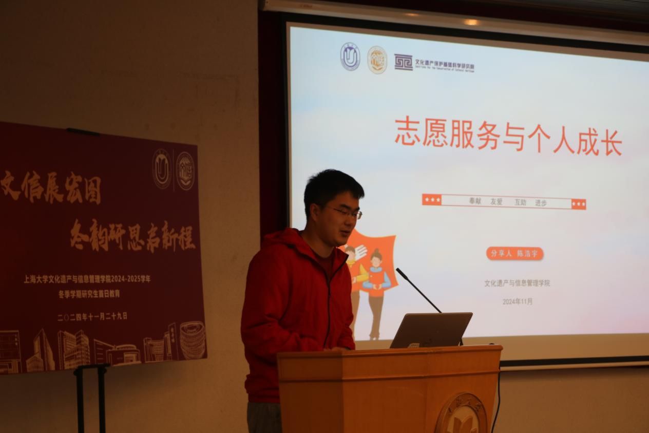2022级文物与博物馆专业硕士研究生陈浩宇以“志愿服务与个人成长”为主题分享志愿经历。首先,他从文物保护专业出发,在实习过程中体会到守护灿烂历史文化遗产的魅力所在,感悟所学有所用;其次,他以校园工作和假期社会实践经历为例,深切体会到以实际行动服务同学和社会的收获感与成就感;最后,他分享参加顾村公园志愿者、国际博物馆协会ICOM会议志愿者、世界考古论坛志愿者等志愿服务经历,传达“志愿服务是一种价值与理念”的深刻感知,鼓励更多文信研究生能够加入志愿工作,实现人生价值。
