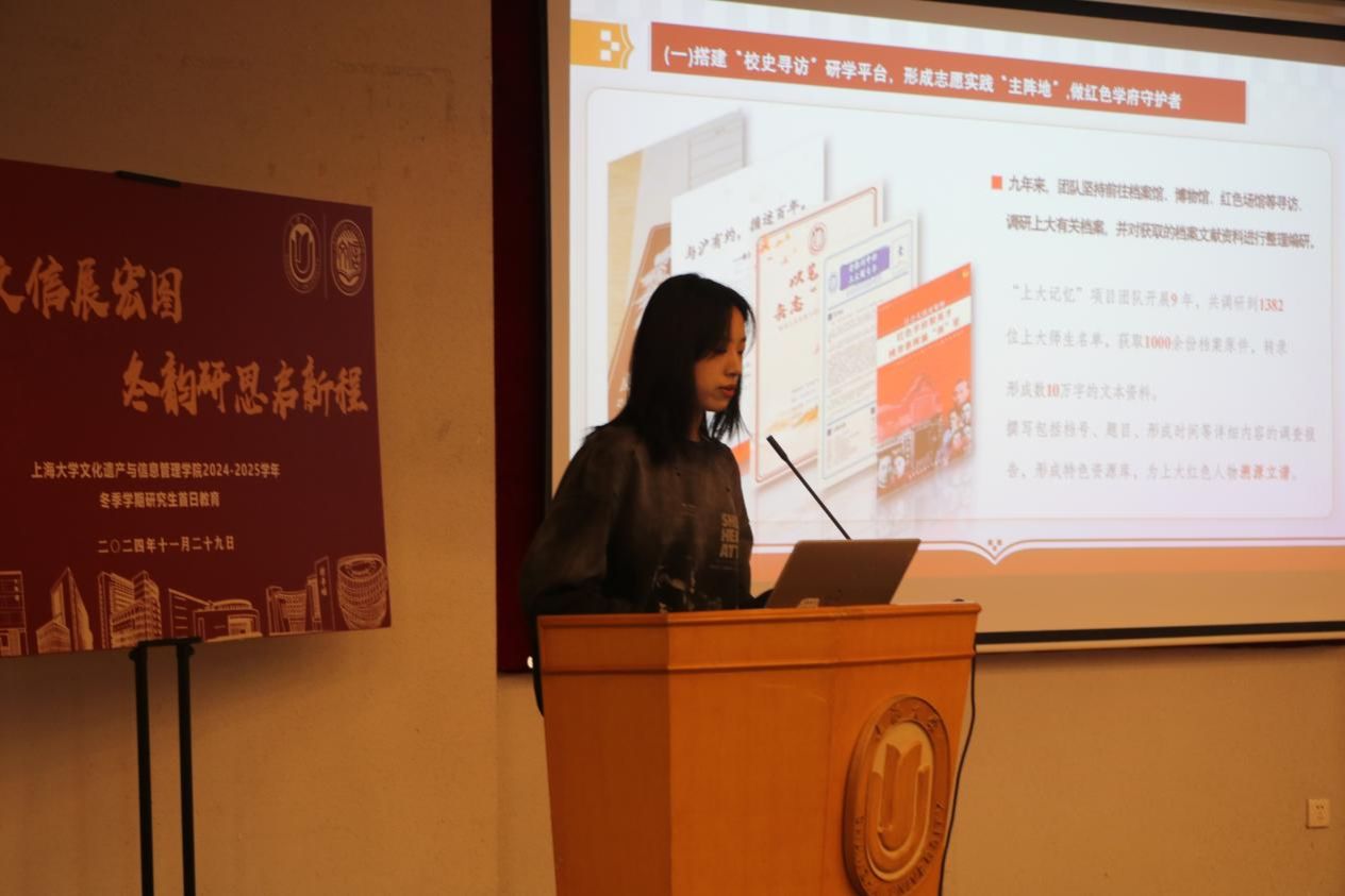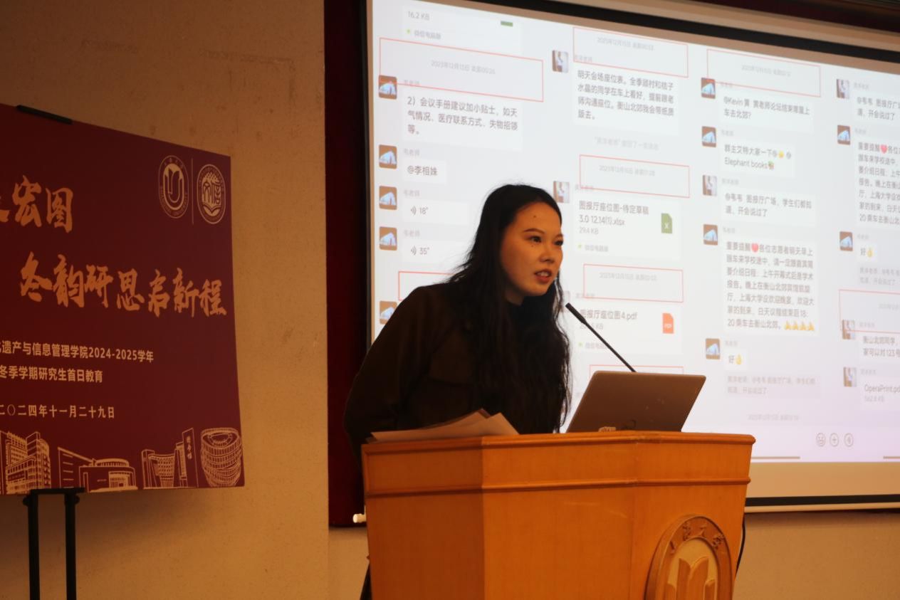2023级档案学专业硕士研究生闫欢欢一方面以第五届世界考古论坛的会议筹划为例,介绍成为重大会议志愿者应具备的素质条件,建议文信研究生注重积累学生工作和志愿服务经历;另一方面,她介绍中共一大纪念馆志愿讲解服务的相关情况,该文信品牌活动为文信学子赓续红色基因、展现青春风貌提供良好的平台,她号召更多的文信研究生能够加入讲解队之中,成为红色基因的传承人。