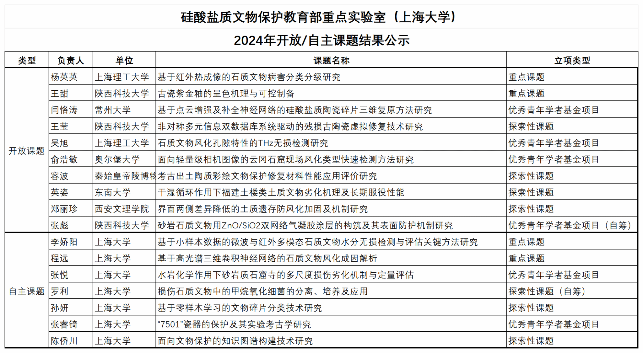 硅酸盐质文物保护教育部重点实验室2024年度课题申报通知发布后,得到了国内外文博机构和高等院校科研人员积极响应。经个人申请、依托单位推荐、形式审查、内部评议、专家评审等多轮环节,最终评选出重点项目4项、探索项目7项、优秀青年学者基金项目6项,名单见附件。