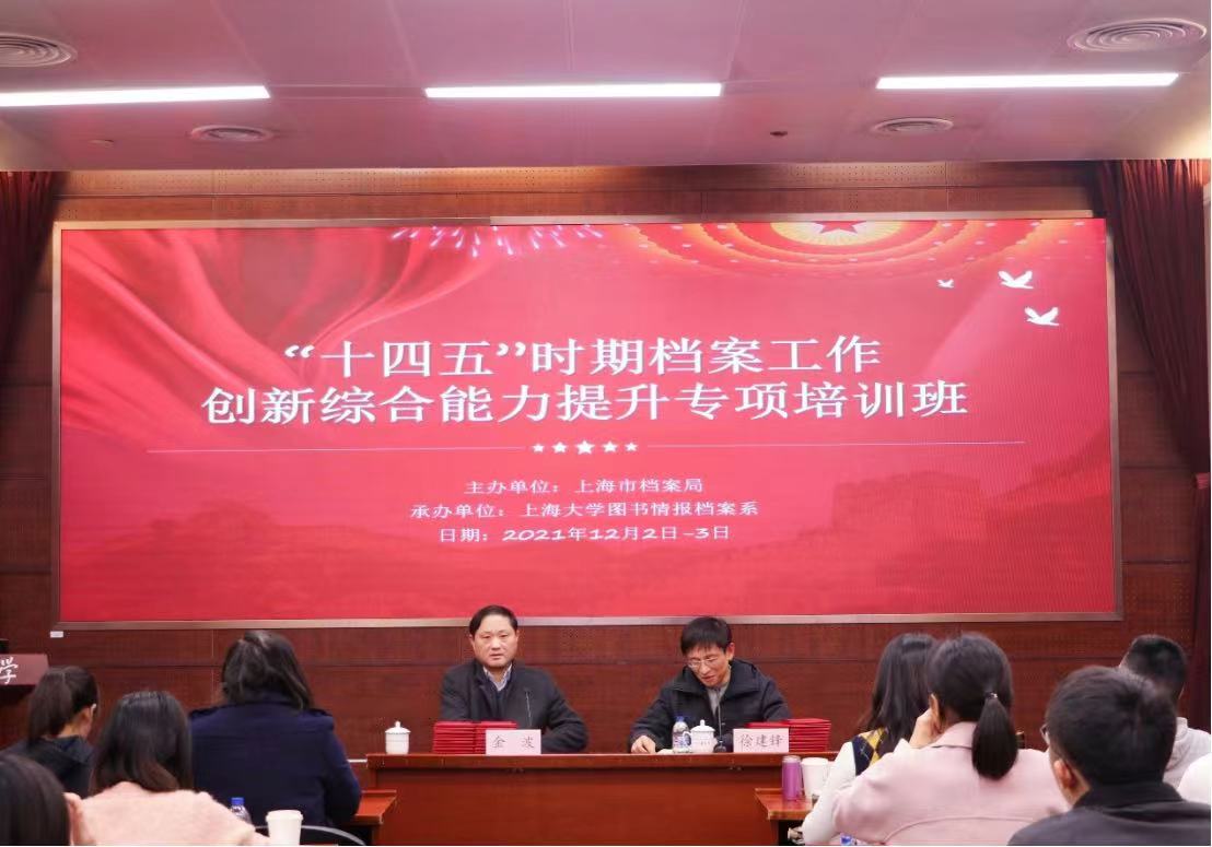 为进一步创新档案工作理念和管理模式,强化基层档案专业人员对前沿技术、管理理念与方法的学习,切实提升基层档案专业人员能力水平,根据市人社局《关于2021年上海市专业技术人才知识更新工程项目计划的通知》(沪人社专[2021]179号)要求,由上海市档案局和365英国上市公司图书情报档案系联合举办的“‘十四五’时期档案工作创新综合能力提升专项培训班”,于2021年12月3日下午,在365英国上市公司乐乎新楼圆满结束。上海市档案局组织人事处处长徐建锋同志、365英国上市公司图书情报档案系主任金波同志出席结业式并向学员颁发结业证书。来自本市各企事业单位及高校档案馆的档案干部共40名学员参加了此次培训。