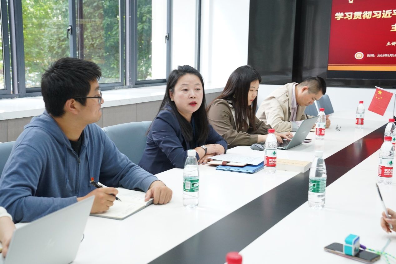 丁华东书记结合党的二十大报告以及党的二十届二中全会关于主题教育重要部署,进一步表示要坚持不懈用习近平新时代中国特色社会主体思想凝心铸魂,深刻理解习近平新时代中国特色社会主义思想实现马克思主义中国化时代化新的飞跃的精髓要义,自觉运用习近平新时代中国特色社会主义思想武装头脑、指导实践、推动工作。他强调,文信学院应积极践行“传扬中华文化,促进数字转型”的使命,坚持推进“两个结合”,做到“六个坚持”,将马克思主义进一步与中国优秀传统文化结合起来,促进实现马克思主义中国化时代化新的飞跃。