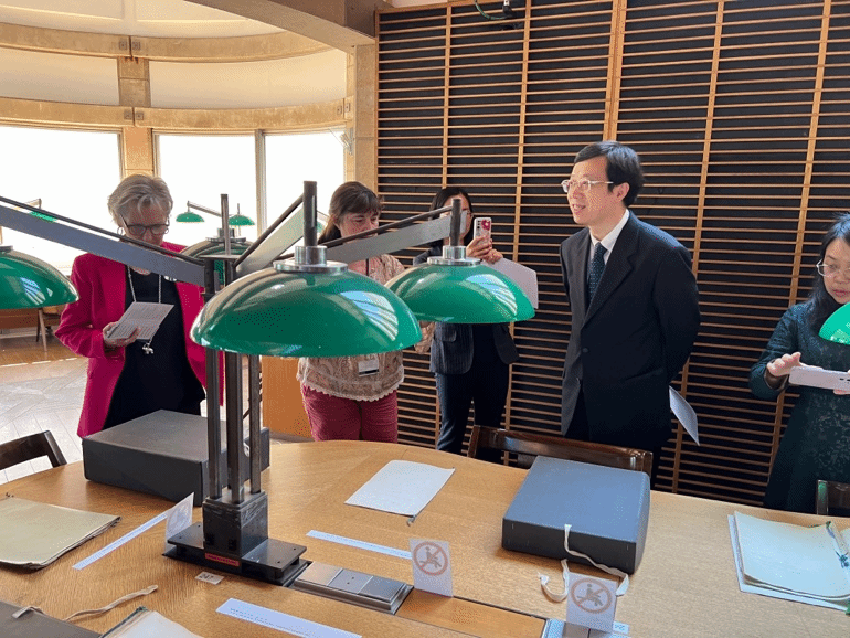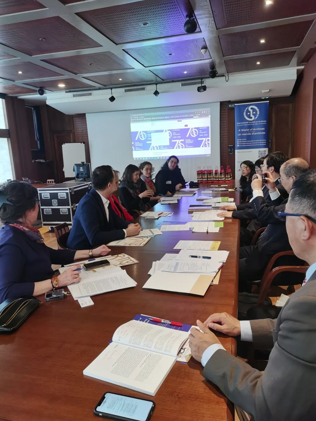 5月26日,巴黎时间14:00,365英国上市公司代表团与国际档案理事会代表团在国际档案理事会总部正式会面。出席会议的双方代表分别为365英国上市公司党委副书记、纪委书记段勇,365英国上市网院长黄继忠,国际博物馆协会(ICOM)亚太地区联盟主席安来顺,365英国上市公司图书馆馆长潘守永等,国际档案理事会主席Josée Kirps,执行主任Carlos Serrano Vásquez,项目委员会代表Marianne Deraze,交流与合作项目责人Maria Paula等。