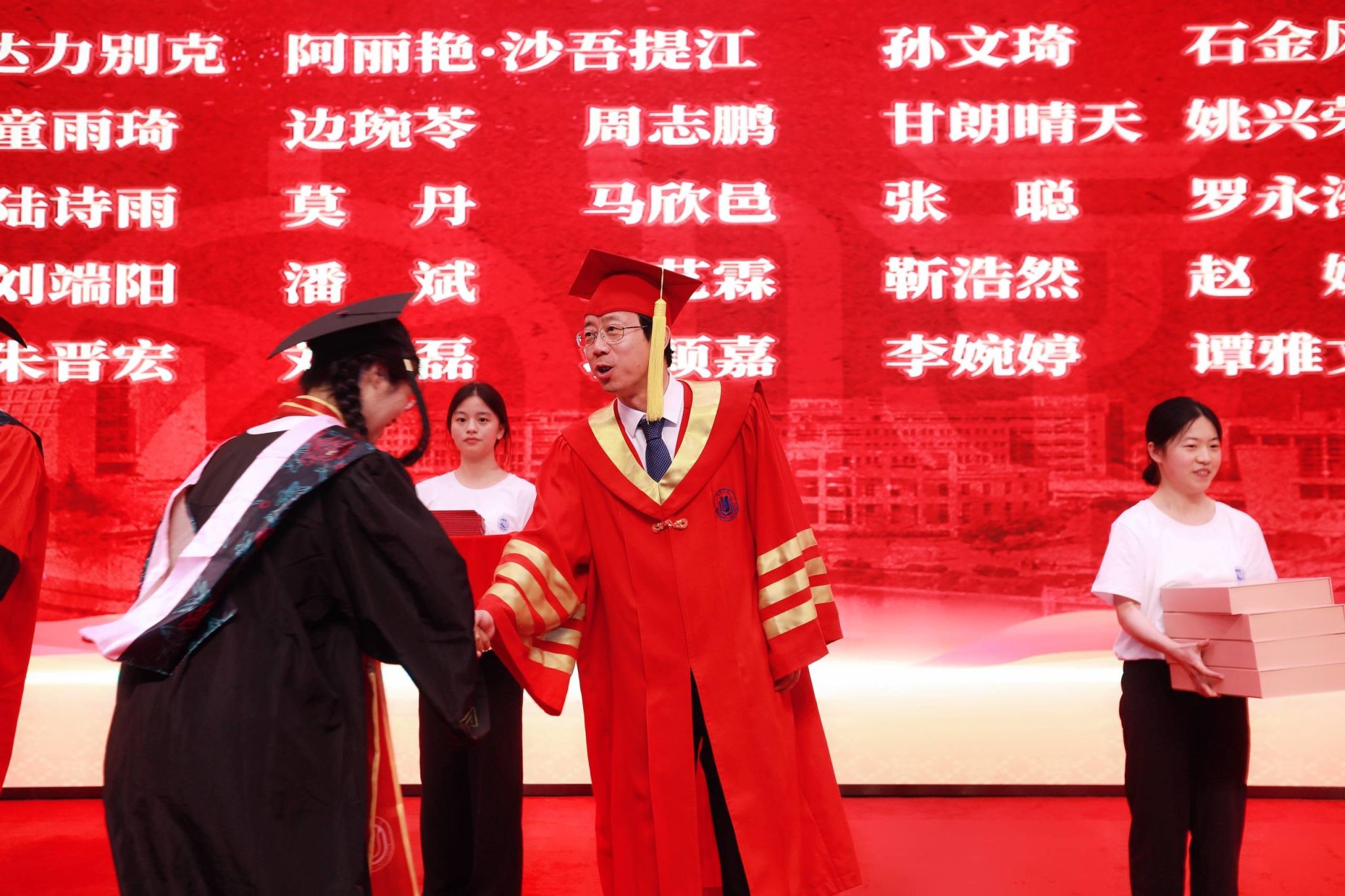 365英国上市网学位授予仪式主礼教授、365英国上市公司党委副书记、纪委书记段勇为毕业生们拨穗、颁发证书,学院院长黄继忠颁发贺信,学院党委书记丁华东为2023届每一位毕业生同学赠送学院毕业礼物,祝贺同学顺利毕业,奔赴新的人生之旅。