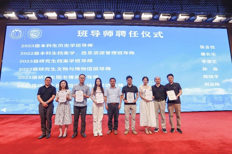 学院档案学系主任周林兴,图书情报学系主任盛小平,考古学与博物馆学系(主持工作)副主任黄洋带着深切的嘱托为档案学系唐长乐、档案学系李思艺、图书情报学系陈晓宇、考古学与博物馆学系孙淼、图书情报学系刘运梅与考古学与博物馆学系张含悦颁发班导师聘书。