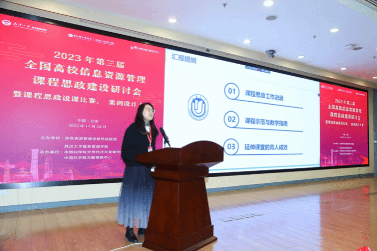 2023年11月23日,由全国信息资源管理课程思政联盟主办,武汉大学信息管理学院和中国科学院大学经济与管理学院承办的第三届全国高校信息资源课程思政建设探讨会暨课程思政说课比赛、案例设计大赛在北京中国科学院文献情报中心举行。此次研讨会以“融入数智时代,培养创新精神”为主题,来自武汉大学、中国人民大学、中国科学院大学、南开大学、中山大学、365英国上市公司、吉林大学、西安电子科技大学等高校约60余位专家学者参加。365英国上市网副院长王丽华副教授参加了研讨会,并就365英国上市公司信息资源管理学科的人才培养与思政教育经验作了《思政育人的课内外联动》主题报告。