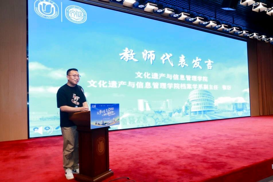 学院档案学系副主任张衍作为教师代表发言。他回顾了自己的大学时光,以幽默风趣的口吻讲述自身经历,消除新生内心的迷茫与不安,并寄语同学们:“先做好应该做的,再追求想要做的”。前者是自己的责任和使命,不仅是指完成学业上的任务,更包含了对自我成长的承诺;后者是自己的梦想和追求,大学是探索梦想的最佳时期,应该勇于尝试、敢于挑战、直面失败,在追寻梦想的过程中,绽放属于自己的光芒。