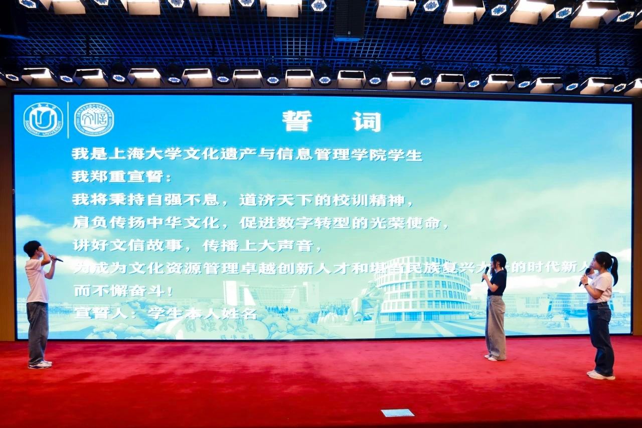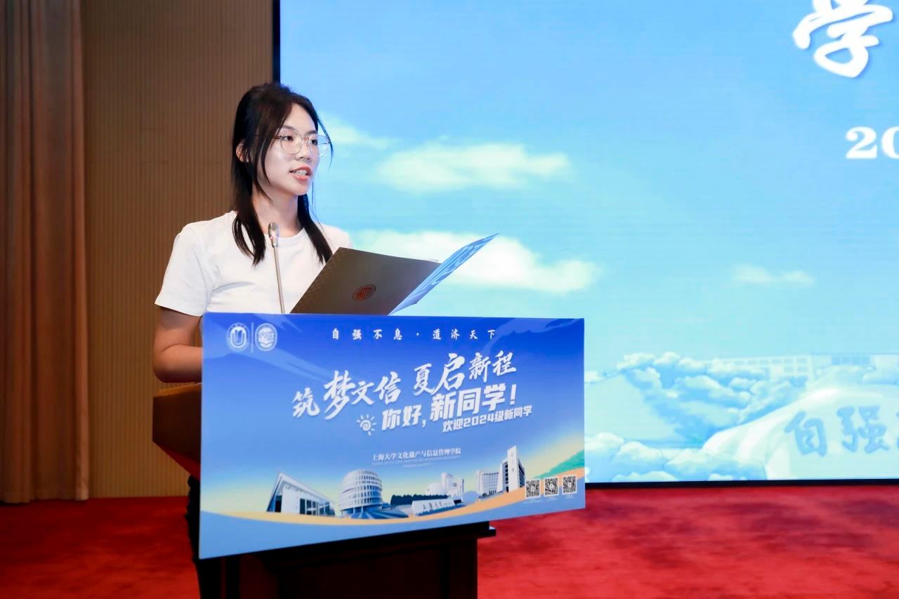 梦想随拼搏展翅,青春与责任同步。2023级图书情报专业硕士研究生覃健恒带领新生代表2024级人文社科大类本科生孙乐恬,2024级图书情报专业硕士研究生徐明珠和全体同学宣誓。