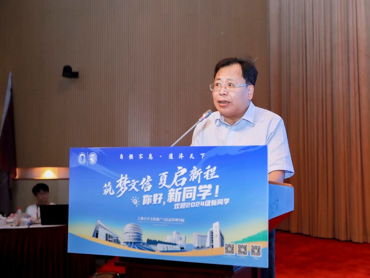 根植传统,面向未来,文信学院是十分年轻、最具蓬勃朝气的学院,亦是历史悠久、学科实力强劲的学院。丁书记指出,在文信学院可以通过良师的言传身教和一流的教学资源塑造能力素养,通过广阔的国际视野和丰富的实践舞台厚植学科情怀,通过崇高的价值追求和伟大的时代使命培育家国责任。作为文信学子,需在推进强国建设、民族复兴伟业中展现青春作为、彰显青春风采、贡献青春力量,奋力书写为中国式现代化挺膺担当的青春篇章。最后,他对新同学们提出三点期望:一要赓续基因、爱国担当、求索真理,做新时代的追梦者;二要致知力行、创新引领、开拓进取,做新时代的探索者;三要善学善思、迎难不馁、德能并进,做新时代的攀登者,以青春之我,担负文信使命,传承上大薪火,成就大美中国。