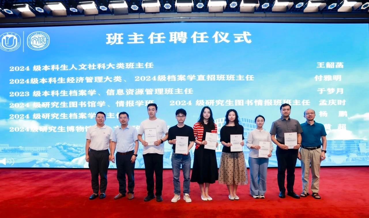学院挂职副院长、考古学与博物馆学系副主任黄洋,档案学系主任周林兴,图书情报学系主任盛小平带着深切的嘱托为考古学与博物馆学系王韶菡、档案学系付雅明、图书情报学系于梦月、图书情报学系孟庆时、档案学系杨鹏和考古学与博物馆学系黄超等六位班主任颁发聘书。