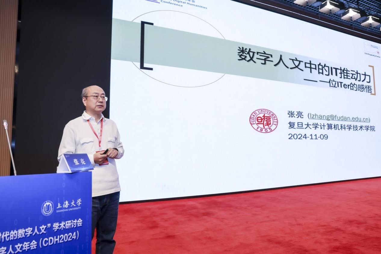 张亮作主旨报告《数字人文中的IT推动力:一个ITer的感悟》,分享对数字人文研究中信息技术作用的见解。他回顾了与复旦大学历史系合作的20世纪中国人物传记数字图书馆项目,探索IT技术在数字人文中的演进路径、技术路线和赋能方式,强调IT基础设施在推动数字人文方法发展中具备关键作用。