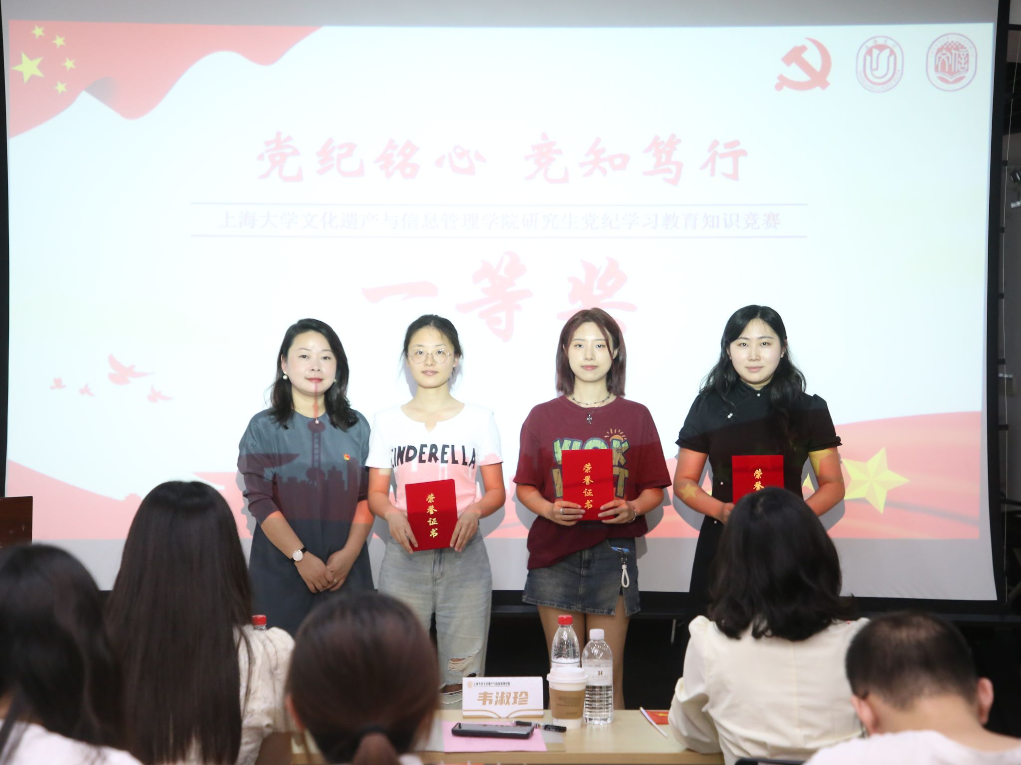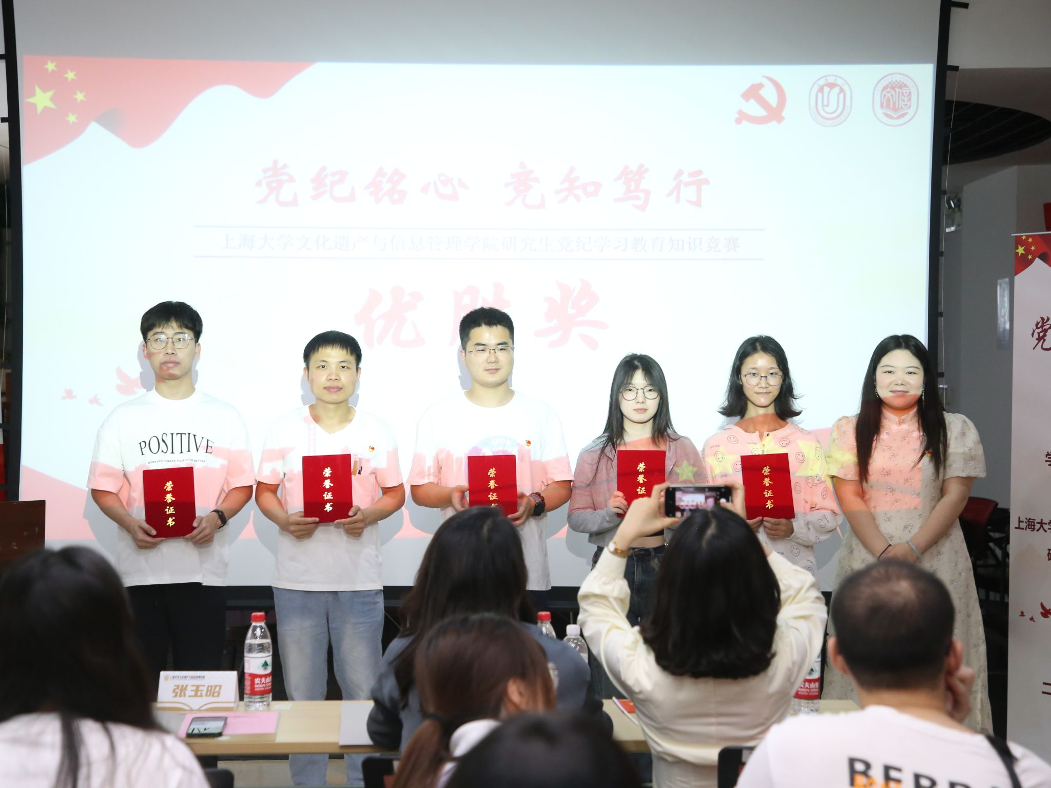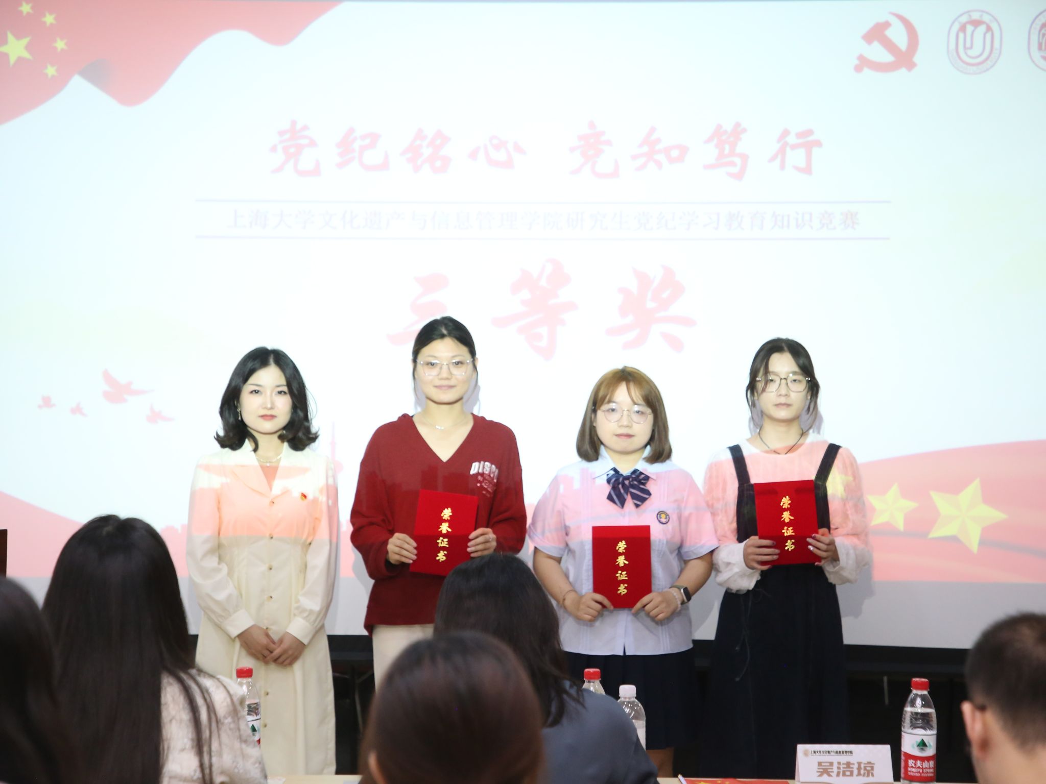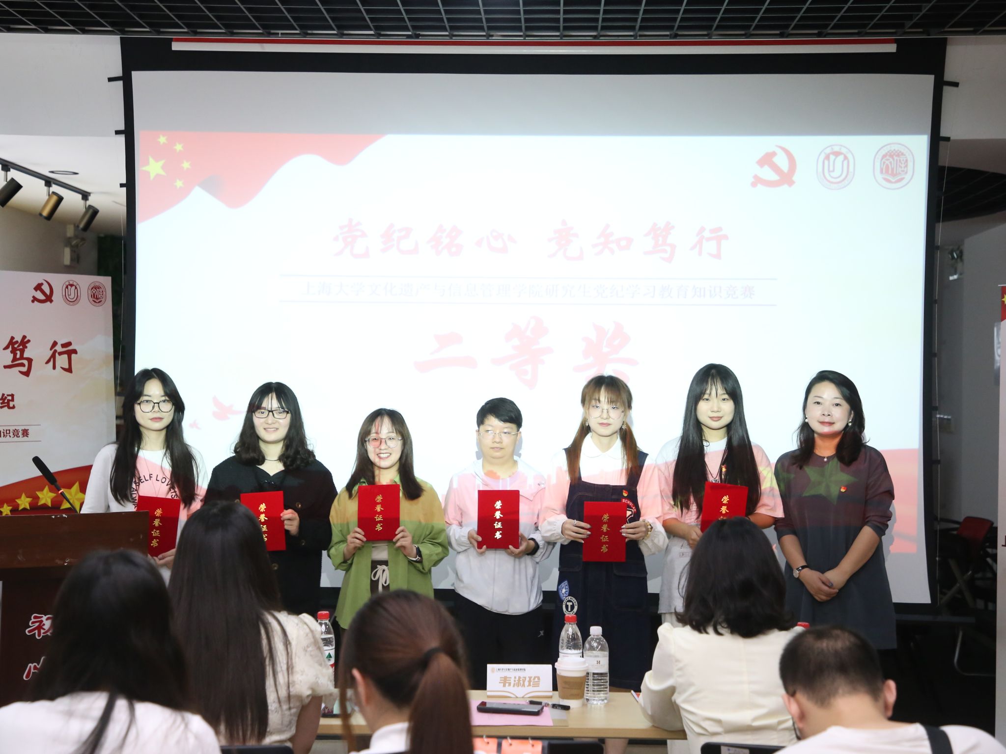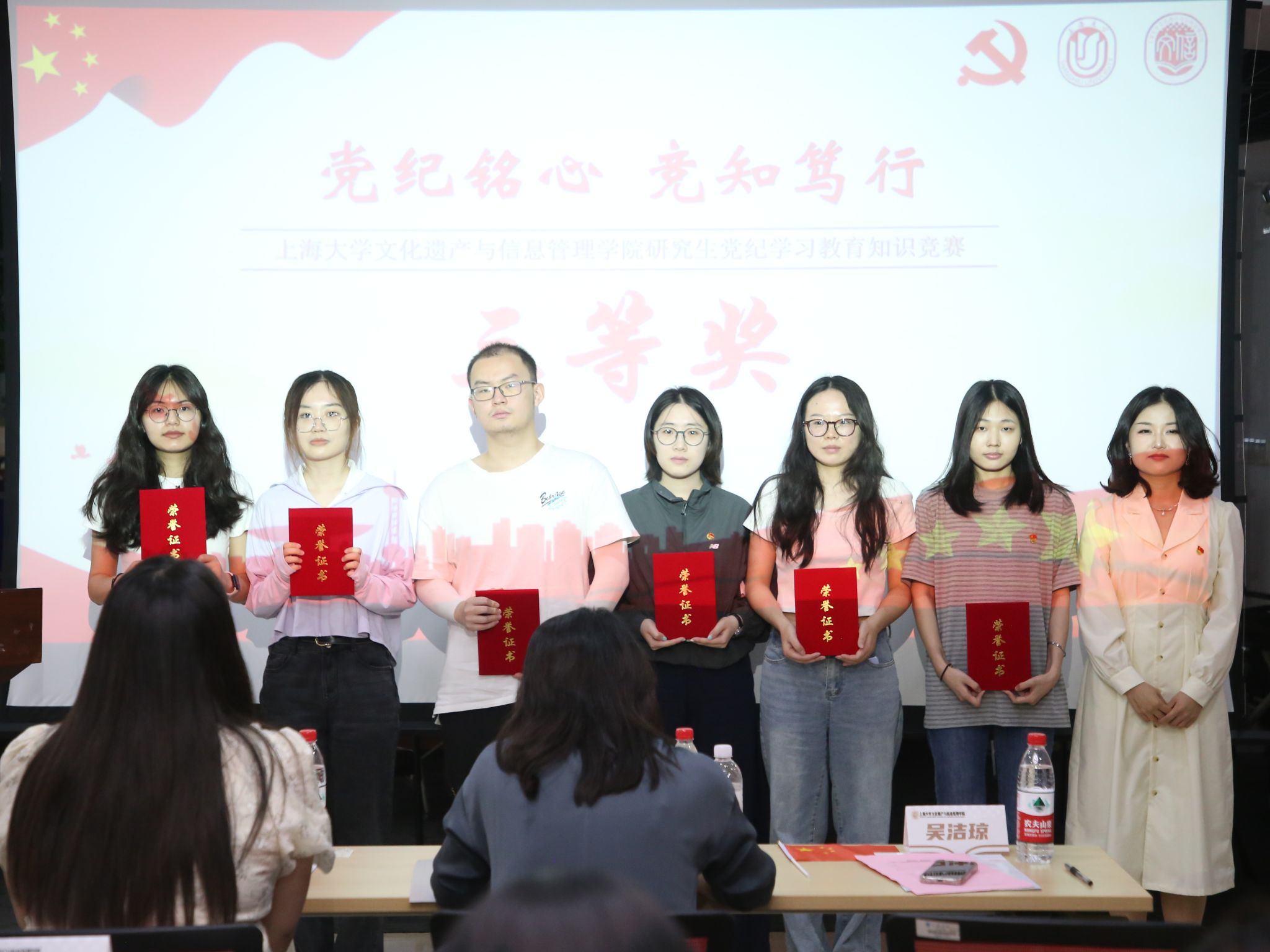 经过精彩比拼、激烈角逐和严谨计分,“火焰队”荣获一等奖,“棉花队”和“文信梦之队”荣获二等奖,“啊对对队”“党纪学习队”和“钢板队”荣获三等奖,“三人行队”“无名队”“你的错来了队”和“文信青年先锋队”荣获优胜奖,与会嘉宾为获奖队伍颁发荣誉证书并合影留念。