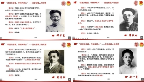 为使我院研究生同学深入学习在中国共产主义青年团发展过程中,涌现出的重要历史人的伟大事迹和突出贡献,以楷模为榜样,接续红色薪火,本次团日活动设置了“团史楷模人物竞猜”环节。该游戏以“你说我猜”的形式展开,竞猜人物均为共青团优秀代表人物。其中,陈独秀为青年团的创建做了思想、干部队伍、实践和组织上的准备,促成了中国共青团的正式成立;邓中夏是中国社会主义青年团的重要领导人、中国工人运动的杰出领袖,对中国社会主义青年团组织的发展作出了重要贡献。