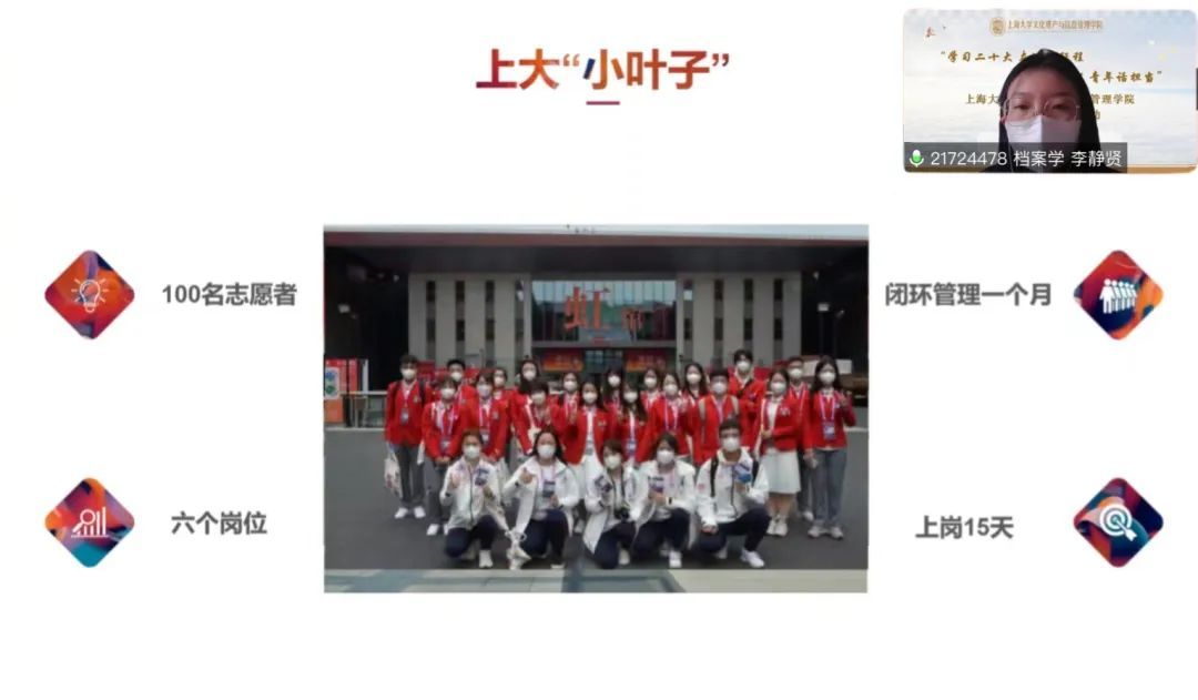 2021级档案学硕士研究生李静贤基于自身经历讲述了第五届进博会志愿服务的感受和经验。李静贤先是从进博会最具特色的四叶草形场馆以及场馆内部展区的划分开始介绍,进而讲述了四个有趣的展区——食品及农产品展区、汽车展区、技术装备展区和消费品展区,展区内或先进新潮或富有趣味的产品和服务充分调动了大家的兴趣。此外她还分享了作为进博会“小叶子”从报名面试到闭环培训再到上岗服务的全程经验,为后续想要参与进博会志愿服务的同学提供了细致全面的讲解。李静贤表示,进博会志愿服务的经历是是一次既充实又难忘的人生体验,希望研究生同学们继续发扬志愿服务精神和先忧后乐的品格,以朝气蓬勃、时不我待的姿态为人民群众办实事、做好事。