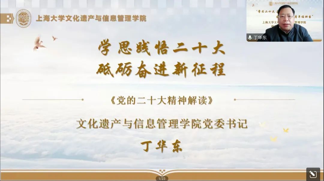 院党委书记丁华东对同学们在疫情下的健康防护以及离校返乡问题表示亲切关心,强调疫情防控正平稳有序地转变,在大家的共同努力下,未来形势会越来越明朗。随后,丁老师对党的二十大精神进行了三方面的解读。第一,阐明了当代中国青年需要学习党的二十大精神的重要原因以及学习党的二十大精神的主要方法,强调研究生同学们要正确认识到建党百余年来,国家发生的深刻的、历史性的变化,充分感知自身肩负的使命和担当,通过反复研读党的二十大报告原文,深刻领会报告的重要内涵,贯彻落实党的二十大精神,为全面建成社会主义现代化强国贡献力量。第二,强调研究生同学们要结合自身专业知识学习和思考党的二十大精神、中国特色社会主义新时代中所强调的文化自信与文化体系建设等内容,在加强自身专业理论学习的同时,将所学所悟与党的二十大提出的目标任务相衔接。第三,倡导研究生同学们积极投身实践锻炼,学习贯彻落实党的二十大的精神,在学习的过程中将理论知识和社会实践有机结合,让学习不停于理论上,更是真正地落在实处,在实践中深入领悟。最后,丁老师希望研究生同学们继续勤勉笃学、刻苦钻研,期待明年春暖花开,师生再次相聚校园。