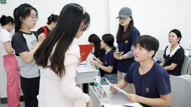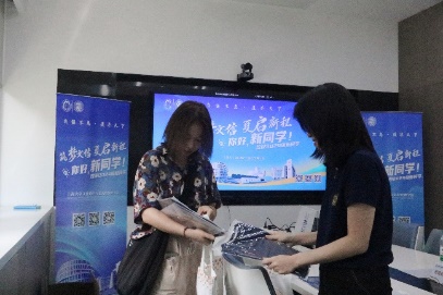 学院团委副书记、研究生辅导员杨倚天,学院研究生党总支书记、研究生辅导员张玉昭全程跟进现场迎新动向,与文信党团学学生骨干一同为研究生新生进行资格审查、录取通知书提交、身份证审核、党团关系交接、入学礼包发放等。文信迎新师生团队配合默契,精准推进各项环节,确保报到工作有序进行且完美达成目标,展现专业高效的工作作风。