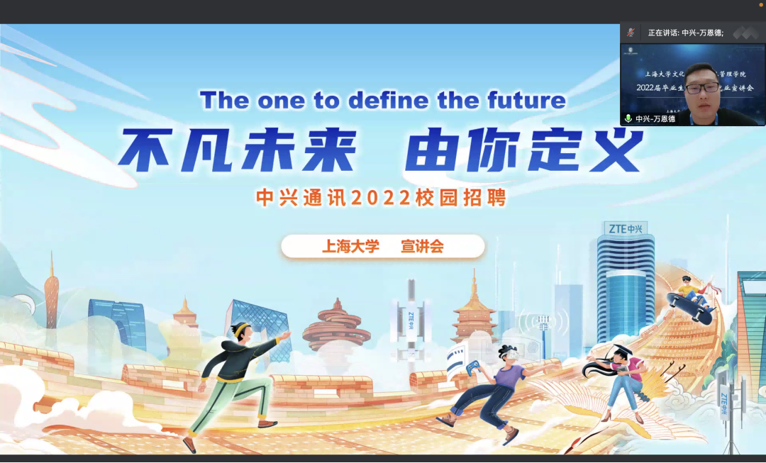 中兴通讯股份有限公司,是全球领先的综合通信解决方案提供商,是中国最大的通信设备上市公司,通过全系列的无线、有线、业务、终端产品和专业通信服务,满足全球不同运营商的差异化需求。中兴通讯股份有限公司档案三科科长万恩德介绍了中兴通讯的企业历程、聚焦的商业态势、目标市场以及三大主营业务、文化氛围、培训资源体系、人才发展路径和薪酬福利。针对文信学院的专业特色,他对信息管理部门进行了体系、部门、岗位、任职需求、招聘流程的详细介绍。同学们就实习要求、招聘重点、薪资待遇以及春招要求等问题与万恩德先生进行线上的交流,得到了细致的解答。