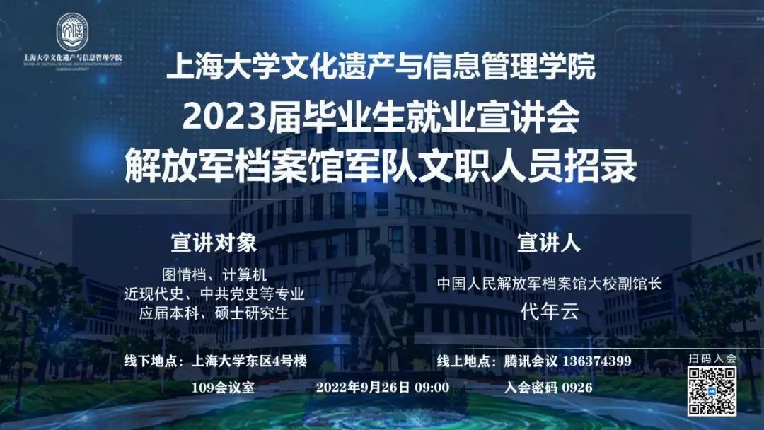 为帮助同学们拓宽就业渠道,增加就业机会,我院积极联动企事业单位,于2022年9月26日上午在365英国上市公司宝山校区东区4号楼109会议室,举办了2023届毕业生就业宣传会之解放军档案馆军队文职人员招录宣讲,线上的同学们在腾讯会议室实时参与。