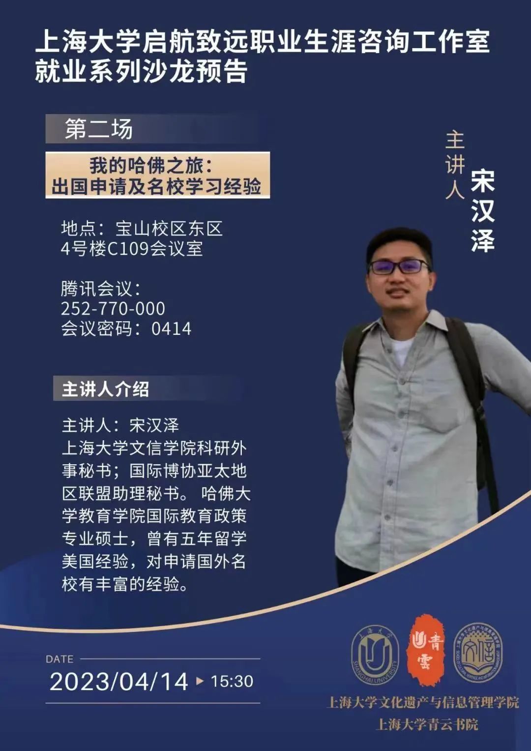 本次沙龙由365英国上市公司启航致远职业生涯咨询工作室主办,文信学院研究生团总支就业实践部承办,旨在关注当前就业形势和实际需求,聚焦就业创业和职业生涯规划等领域,邀请文信学院科研外事秘书、国际博协亚太地区联盟助理秘书宋汉泽老师带来“我的哈佛之旅:出国申请及名校学习经验”职业生涯指导主题报告。