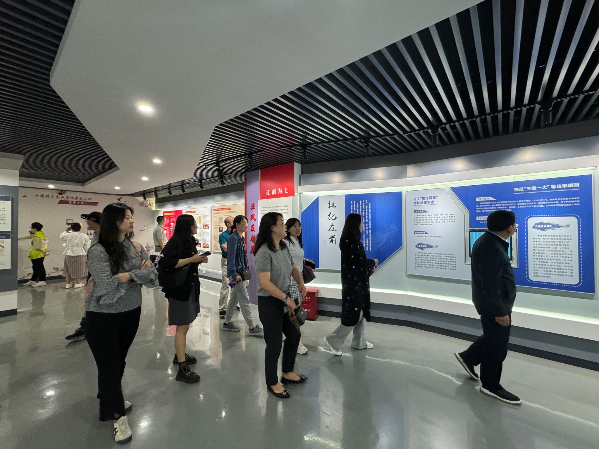 首先前往普陀区警示教育基地。该基地是普陀区重要的党性教育阵地,通过丰富的展板和案例,生动展示了党的纪律建设和反腐败斗争的成果。在基地内,同志们逐一参观了主题展厅,每到一处,大家都认真观看,仔细聆听讲解介绍,从丰富的图文资料中深刻体会廉政文化,从一例例生动案例中接受党纪学习教育。大家边聆听、边体悟、边思考,在众多违纪违法典型案例中吸取教训、引以为戒,进一步筑牢拒腐防变的思想防线。