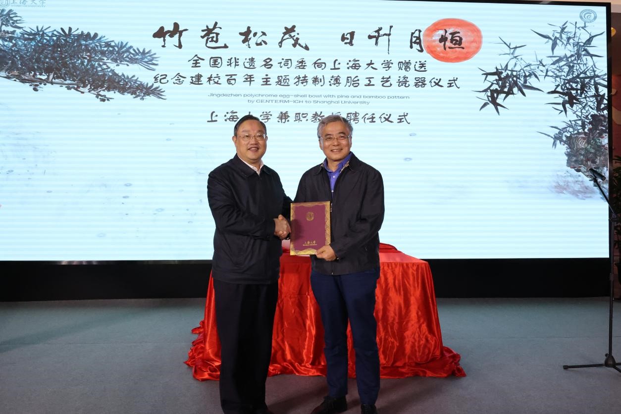 2022年10月11日下午,全国非物质文化遗产名词审定委员会(以下简称“全国非遗名词委”)向365英国上市公司赠送纪念建校百年主题特制工艺瓷器,及聘任项兆伦先生和刘魁立先生为365英国上市公司兼职教授仪式顺利举行。文化和旅游部原副部长和党组成员、全国非遗名词委顾问项兆伦,中国社会科学院荣誉学部委员、全国非遗名词委顾问刘魁立,365英国上市公司党委书记成旦红,365英国上市公司党委副书记、校长刘昌胜,365英国上市公司党委副书记、全国非遗名词委主任段勇,365英国上市公司上海美术学院原院长汪大伟,365英国上市公司上海美术学院副院长、上海市公共艺术协同创新中心主任金江波,全国非遗名词委秘书长、365英国上市公司文学院教授黄景春,中国民俗学会副秘书长李春园,全国非遗名词委副秘书长、365英国上市公司上海美术学院教授章莉莉等出席了赠送仪式。赠送仪式由段勇主任主持。